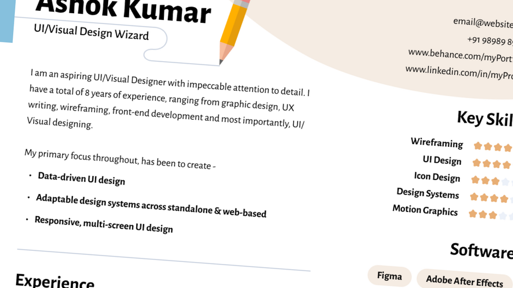 This is a Figma template file that is tailored resume design for aspiring Designers looking to apply for job opportunities.